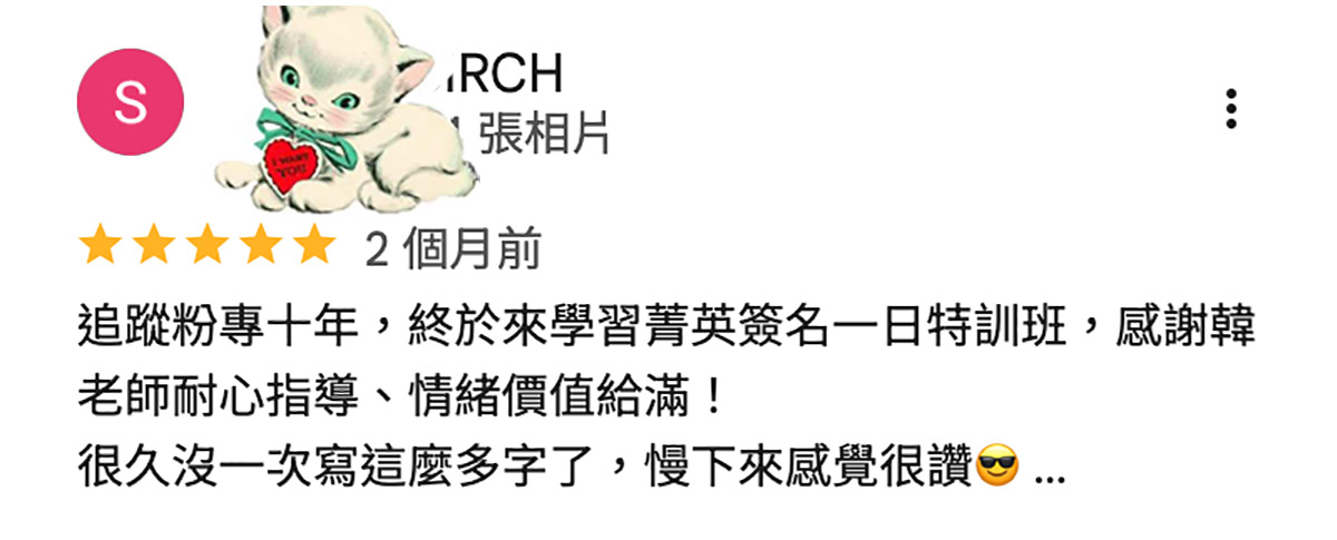 「追蹤粉專十年,終於來學習菁英簽名一日特訓班。感謝老師耐心指導,情緒價值給滿。很久沒有一次寫這麼多字了,慢下來的感覺很好。」