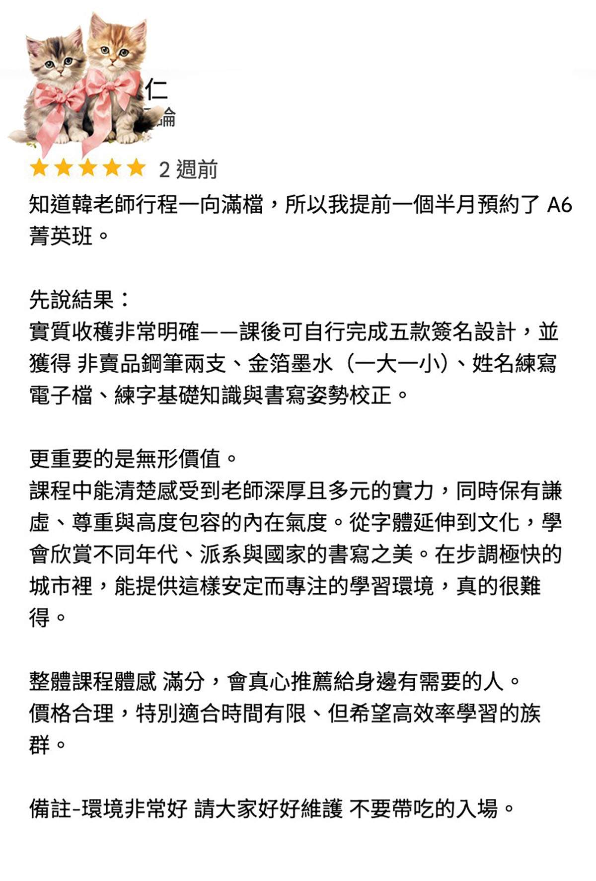 | A6 菁英簽名尊榮班:個人品牌形象,創意設計。限量贈:韓老師私人珍藏,藝術簽名古鋼筆。0328(六午),專屬1對1複習邀請。 | 2026-03-28 星期六 | 12:00 - 18:00 | 台北 | 1 位 | NT$29,800 NT$48,000 |