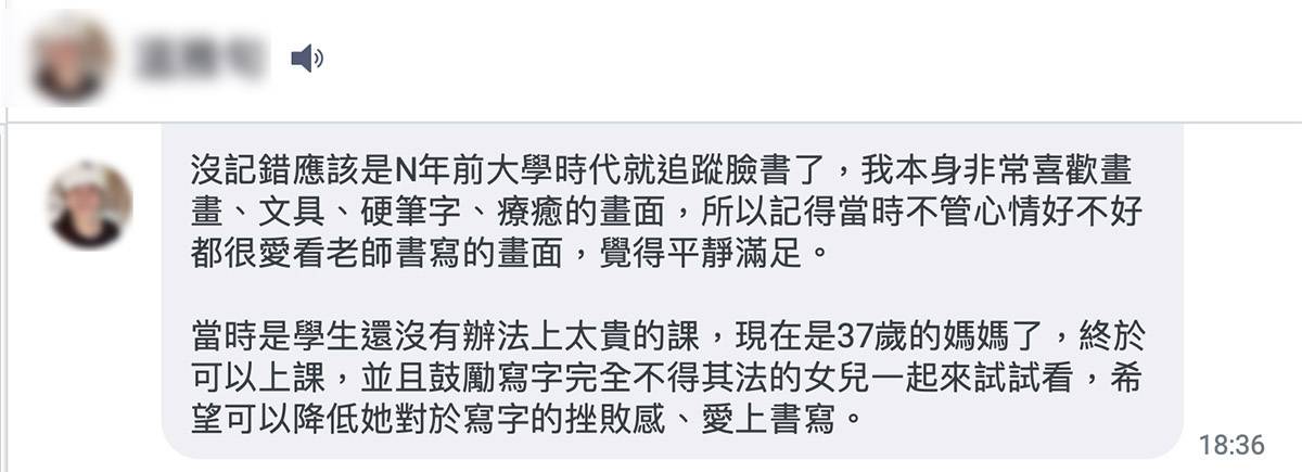 她說:「不管心情好不好,都很喜歡看老師書寫的畫面,會有一種平靜、滿足的感覺。」